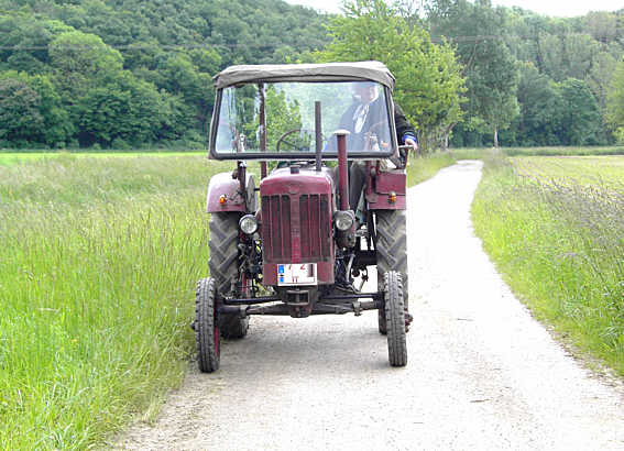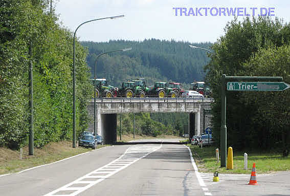 Eine Traktor - Tour der besonderen Art, die sogar über eine Autobahn führte, konnte ich 11. September 2009 im Grenzgebiet zwischen Belgien / Luxemburg und Deutschland fotografieren. Im Rahmen einer “Milchpreis - Protestaktion” führte diese Tour zahlreiche Landwirte mit ihren Schleppern auf die Autobahn A 60 zwischen dem belgischen St. Vith und dem deutschen Winterspelt bei Prüm, wo die Autobahn dann im Bereich der Grenze mit Schleppern “dicht” gemacht wurde. Das Foto entstand auf belgischer Seite von der Landstraße Lommersweiler (Belgien) - Steinebrück - Urb / Winterspelt (Deutschland), wo diese unter der abgebildeten Brücke in der Nähe von Lommersweiler die mit Traktoren zugeparkte A 60 unterquert.